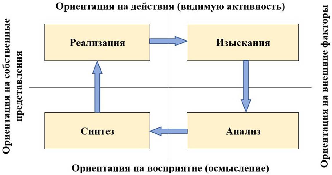 · Модель (цикл) обучения на основе опыта Д. Колба [17, 18], включающая конкретный опыт, рефлексивное наблюдение, абстрактную концептуализацию и активное экспериментирование, находит прямое соответствие в универсальном цикле ТПС (изыскания → анализ → синтез → реализация), получая при этом четкую биологическую привязку.
