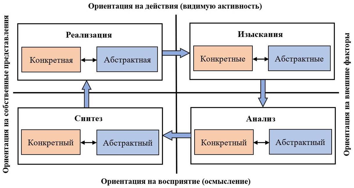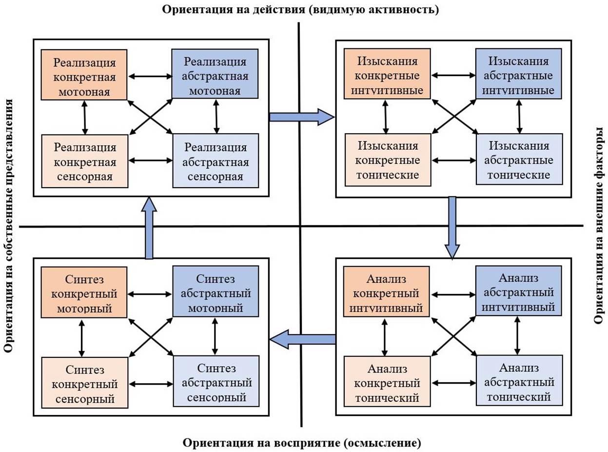 В основе модели лежит представление о целостной деятельности как о циклическом процессе, проходящем четыре универсальных этапа: изыскание (поиск), анализ, синтез и реализация. Каждый этап требует определенной конфигурации когнитивных и поведенческих ресурсов индивида, которая определяется приоритетностью тех или иных подсистем его нервной системы.