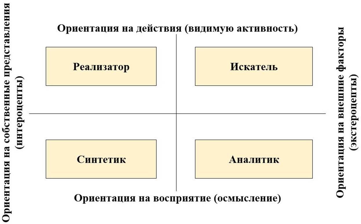 Классические специализации являются начальным уровнем КПС, определяемым комбинацией двух фундаментальных дихотомий, вытекающих из аксиомы 3 (иерархии нервных подсистем): Экстероцепт (внешний мир) / Интероцепт (внутренний мир) и Афферент (восприятие, вход) / Эфферент (действие, выход). Комбинация этих двух дихотомий образует четыре классических специализации (типа), соответствующих четырем этапам природного цикла деятельности: Искатель, Аналитик, Синтетик и Реализатор (рис. 4). Данный уровень КПС является ключевым для формирования сбалансированных рабочих команд.