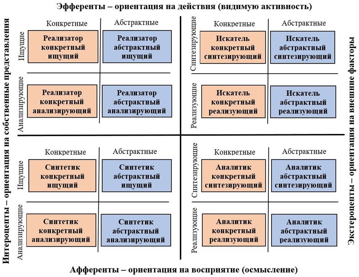 · Эфферент / Афферент – это ориентация на активные действия (выход) или на восприятие и осмысление (вход) (приоритет эфферентной или афферентной подсистемы).