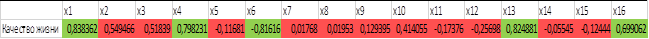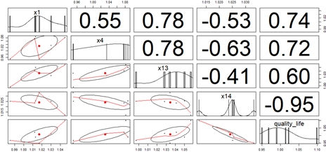 Предлагается проводить анализ показателей качества жизни на основе сравнения линейных коэффициентов корреляции с помощью функции языка программирования R findCorrelation. Между отобранными анализируемыми показателями качества жизни устанавливается корреляционная связь. Далее осуществляется расчет интегральных показателей по отдельным территориям. Также по степени корреляционной связи определяется влияние каждого показателя экономического развития региона на уровень качества жизни. Отбор наилучшей модели осуществляется с помощью функции step языка программирования R (lm(formula = quality_life ~ x1 + x14, data = economics).