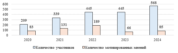 Как видно по данным рис. 1, количество мотивированных мнений увеличивалось до 2022 г., но уже в 2023 г. сократилось в 3 раза и в 2024 г. увеличилось незначительно. Это связано, во-первых, с неизменным количеством участников в 2023 г., уже проработавшим спорные вопросы в 2022 г. Во-вторых, налоговые органы стали чаще использовать предварительные консультации с налогоплательщиками, перенесли фокус на анализ рисков и цифровизацию. Несмотря на это, мотивированное мнение (суждение)является ключевым инструментом совместного комплаенса и профилактики рисков для добросовестных налогоплательщиков. Система налогового комплаенса должна стать логичным продолжением риск-ориентированного подхода на уровне как минимум участников налогового мониторинга и кредитных организаций, которые выполняют большой объем работы по информированию налоговых органов о деятельности своих клиентов. Для эффективной организации налогового комплаенса в деятельности налогоплательщиков было бы рационально налоговым органам разработать методические рекомендации, возможно стандарт по применению риск-ориентированного подхода.