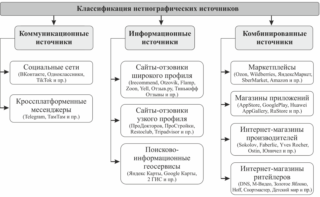Далее целесообразным представляется остановиться на рассмотрении источников информации для реализации нетнографического метода. В базовом заключении основателя метода источники представлены как виртуальные сообщества. С точки зрения практического маркетингового применения метода для изучения аспектов потребительского поведения интерес представляет возможность выделения более полного списка потенциальных площадок, где генерируется коммуникация, подходящая для изучения и дальнейшего использования. С целью систематизации и наглядности широты перечня источников автором разработана классификация источников нетнографической информации, сформированная по тематическим категориям с выделением названий конкретных онлайн-ресурсов. Так, на наш взгляд, объектом нетнографического исследования могут выступать нативные отзывы, комментарии, обсуждения и прочие «цифровые следы» потребителей в источниках представленных на рисунке 1.
