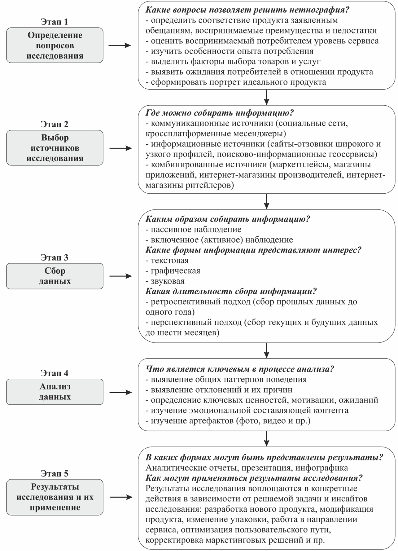 Сформированная дорожная карта нетнографического метода исследования в области маркетинга систематизирует теоретический подход к сущности метода, дает наглядное представление о последовательности действий, возможных источниках информации и ключевых аспектах на каждом этапе исследования.