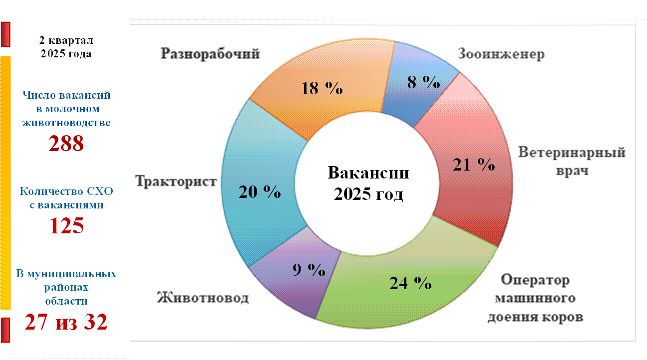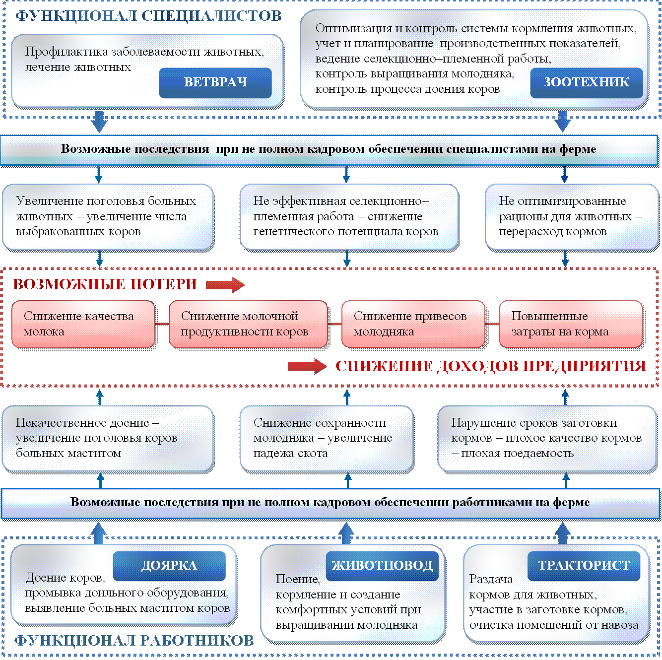Vacancies for key specialists and employees in dairy farming at the present time for agricultural organizations in the Omsk region are shown. The author paid considerable attention to the content of functional tasks for vacant employees and presented a generalized understanding of the possible negative consequences in production with incomplete staffing on the farm and their impact on the economic efficiency of dairy agribusiness. Based on a functional analysis of the work tasks of livestock employees, a diagram of the relationship between staff shortages and production efficiency in the form of lost profits and loss of milk, offspring, body weight gain, and overexpenditure of animal feed is presented. The range of losses in dairy productivity of cows due to reasons related to the shortage of specialists and workers in animal husbandry is shown; and the projected additional milk production volumes in farms with different levels of efficiency are calculated.