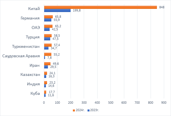В последние годы наблюдается активное расширение макроэкономических связей Российской Федерации с рядом стран. Только с начала 2025 года было заключено более 1000 соглашений в рамках Петербургского международного экономического форума (ПМЭФ) [4], проведено 96 совместных мероприятий с КНР [8], запущены новые авианаправления в том числе в Нячанг (Вьетнам), Хайнань (КНР), ожидается появление рейсов между Россией и Саудовской Аравией, Оманом и многими другими [33]. Статистика показывает и увеличение туристских прибытий на 1,57 млн. человек в 2024 году, что в 2,3 раза больше, чем в 2023 [3]. Лидером по турпотоку стал Китай, откуда за четыре квартала приехало 848 тыс. туристов (Рисунок 1) [3].