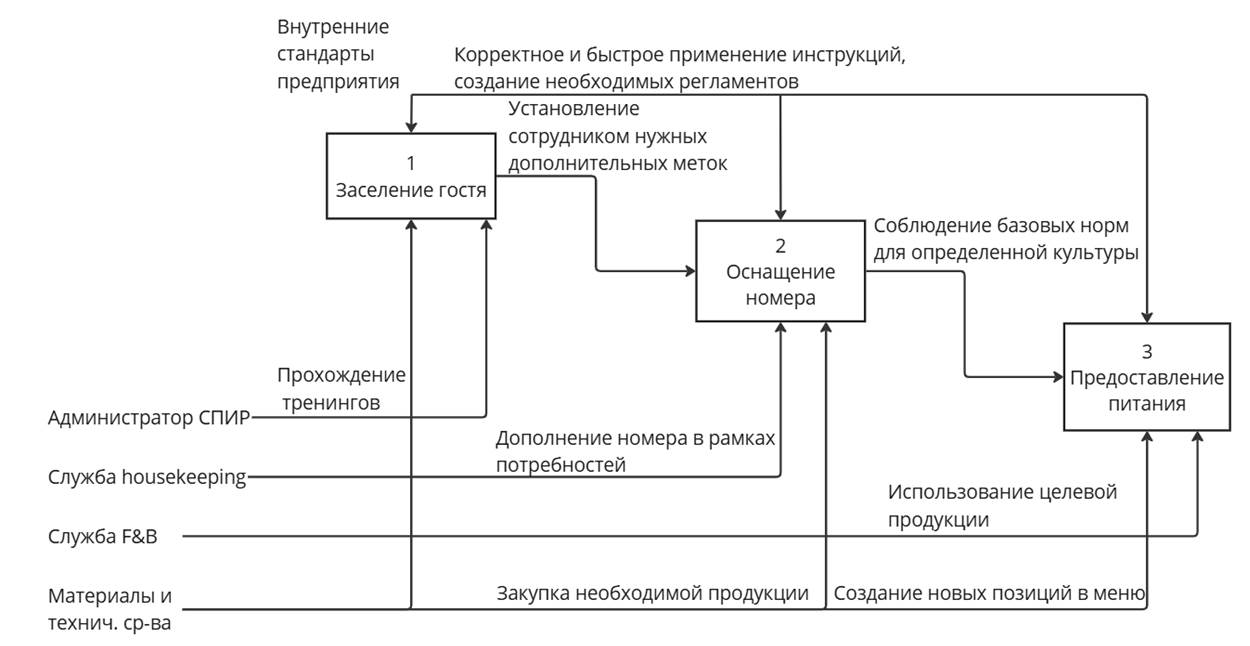 Для отельера наиболее простой, но малоэффективный способ внедрения новых правил работы, основанных на удовлетворении национальных особенностей гостей является проведение обучения сотрудников новым навыкам. Однако этого мало, так как для полноценного внедрения элементов кросс-культурного менеджмента необходимо обратиться к внутренней документации гостиницы, функциям управления и потоку создания ценности гостиничной услуги. Наиболее удобным инструментом, охватывающим все эти элементы является моделирования бизнес-процессов гостиницы в нотации SADT.