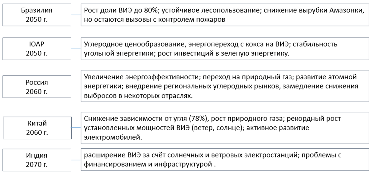Обобщая информацию о реализации экологических портфелей стран-участниц, следует отметить, что все страны объявили цели по достижению углеродной нейтральности в диапазоне 2050-2070 годов (Бразилия и ЮАР к 2050 г., Россия и Китай к 2060 году, Индия к 2070 году). При этом, устойчивый энергетический переход должен совершаться в условиях сохранения социально-экономической стабильности: обеспечение стабильного экономического роста без значительных колебаний цен на энергоносители, учет интересов всех слоев населения, включая регионы, зависящие от традиционных видов энергетики, переход на экологически чистые технологии.