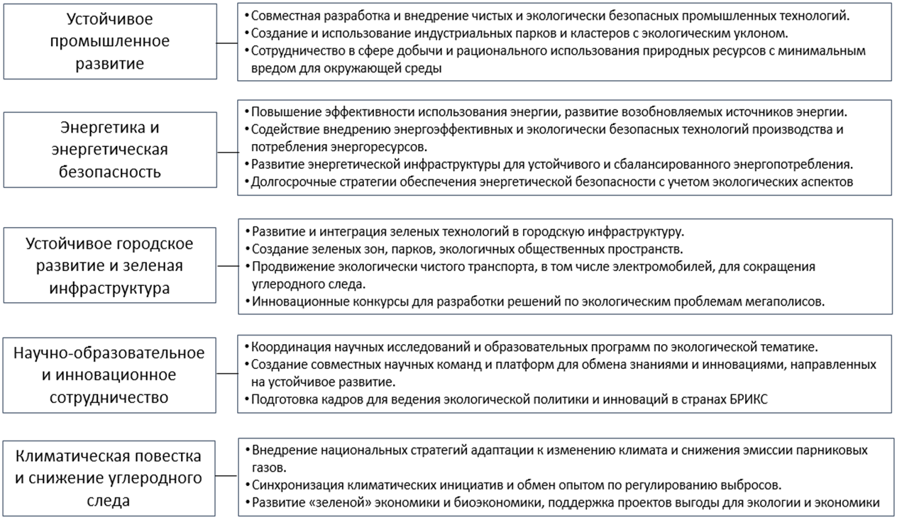 Ключевые стратегии экологического развития, предложенные для стран БРИКС, включают такие направления, как устойчивое промышленное развитие, энергетическая безопасность, зеленая инфраструктура, научно-образовательное и инновационное сотрудничество (рисунок 2) [3, 12].