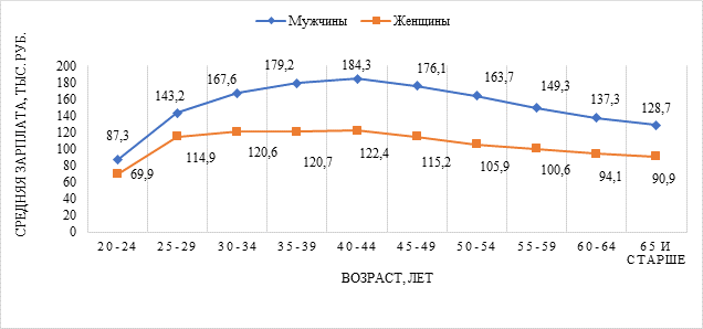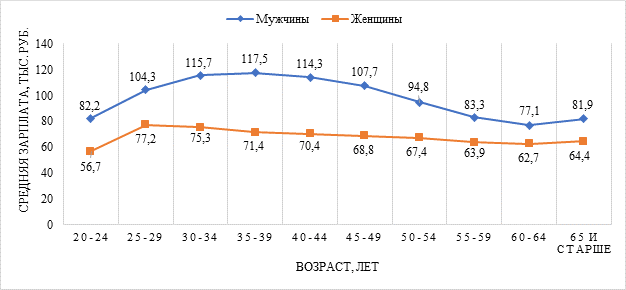 Самое высокое значение показателя гендерного разрыва в оплате труда отмечается в группе занятий – специалисты среднего уровня квалификации, для которой также следует провести анализ изменений уровня средней заработной платы в зависимости от пола и возраста (рис. 3).