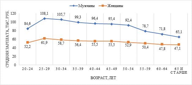 Based on the results obtained, three groups of professions with the greatest imbalance of men's and women's wages and salaries are identified. They are: managers, specialists of higher and intermediate qualifications. For these occupation groups, an analysis of changes in the monetary remuneration for employees of both sexes of different age categories is carried out.