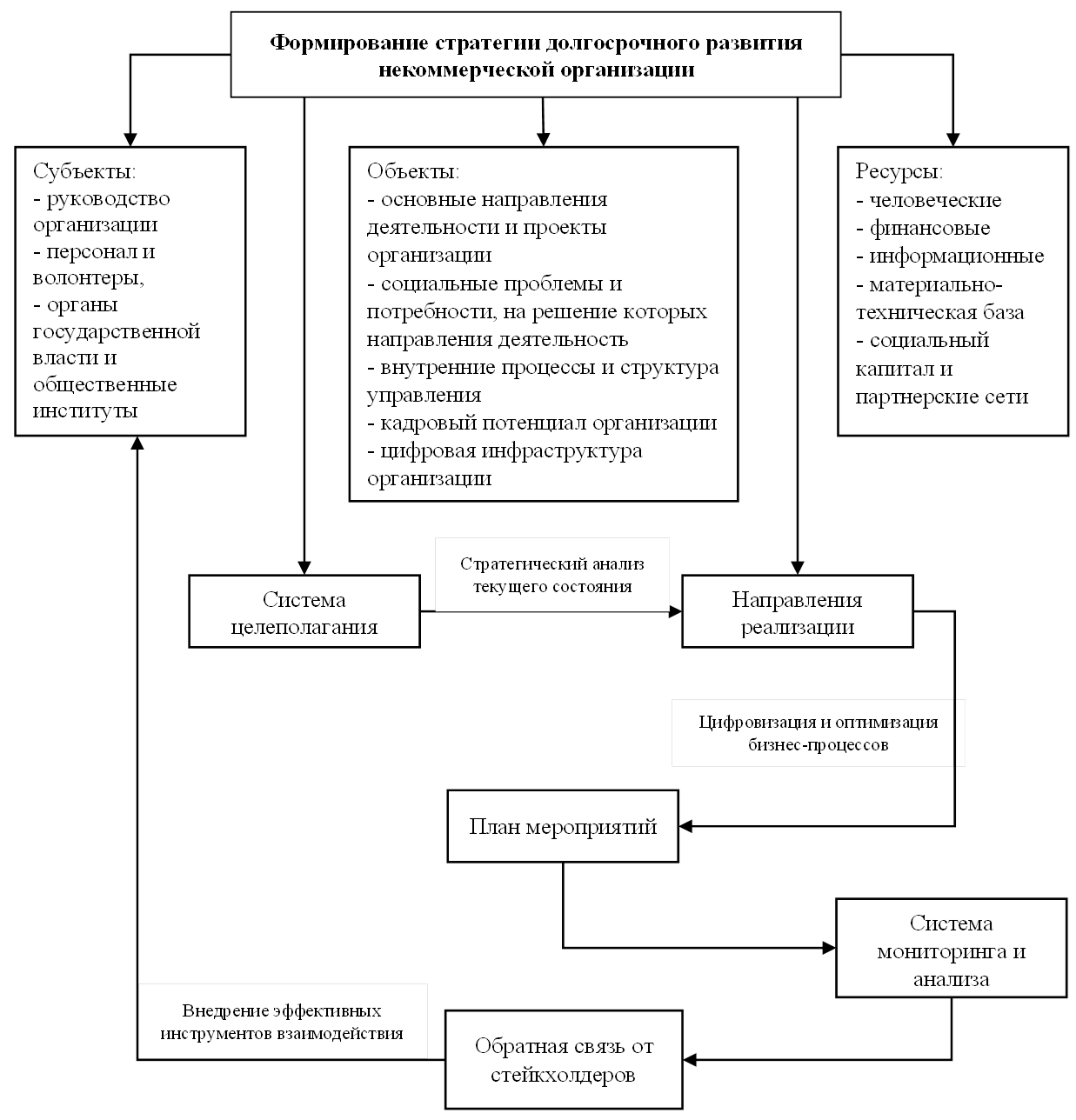 В соответствии с авторским подходом стратегия долгосрочного развития некоммерческой организации представляет собой системный, комплексный и перспективный план, определяющий миссию, цели, видение и ключевые направления деятельности организации на длительный период, а также пути и методы их достижения в условиях динамично изменяющейся внешней среды. Данная стратегия служит основой для принятия управленческих решений и координации ресурсов с целью обеспечения устойчивости и эффективности работы организации.
