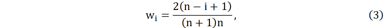 Весовые коэффициенты в данном случае определяем с применением экспертного метода иерархии. Суть данного метода в том, что каждый из экспертов должен проранжировать n показателей группы по степени важности, где 1 – наиболее важный, n – наименее важный. Полученные результаты подставляем в формулу Фишберна [17] (Seagal, 2021):