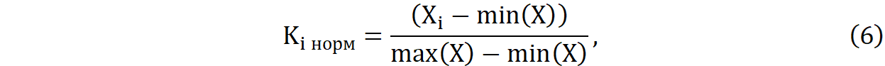 Региональные показатели привлекательности также имеют разную сущность и природу оценивания, для них проведем нормализацию данных при помощи метода Минимакс. Для этого используем статистическую информацию по регионам России за аналогичный период. Выборка регионов для оценивания происходит исходя из условия, что в данном регионе потенциально может быть реализован аналогичный проект. Чтобы нормализовать значения используем формулу 6: