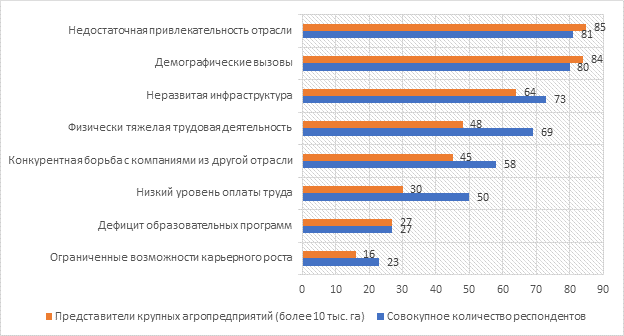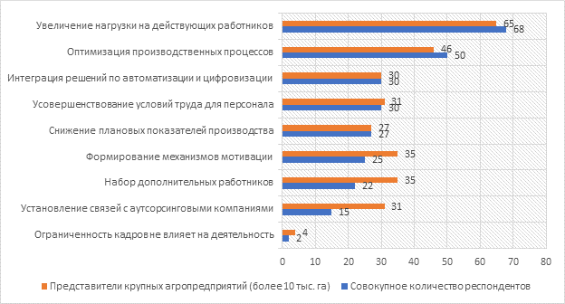 Согласно результатам опроса, респонденты отметили, что максимально отрицательное влияние на уровень качества реализации и регулирования работ оказывает недостаток агрономов. В свою очередь, нехватка водителей грузовых автомобилей и специализированной техники наиболее ярко проявляется в периоды проведения посевной кампании, выращивания и сбора урожая. Дефицит требуемого числа механизаторов ограничивает возможность организации круглосуточной непрерывной работы в полевых условиях.