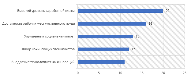 Тем временем исследование, проведенное кадровым агентством «UTEAM» и компанией «Grodan», выявило, что уровень привлекательности агропромышленного сектора в качестве места трудоустройства среди молодежи остается крайне невысоким. Интерес молодых специалистов к АПК, согласно результатам респондентов, может быть стимулирован определенными условиями, включая высокий уровень заработной платы, доступность рабочих мест умственного труда и улучшенный социальный пакет (рис. 5) [13].