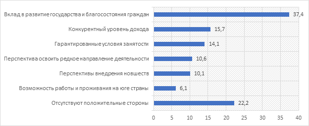 Среди главных положительных сторон работы в агросекторе России, согласно данным опроса, 37,4% участников опроса выделили вклад в развитие государства и благосостояния граждан, 15,7% опрошенных отметили конкурентный уровень дохода, 14,1% респондентов подчеркнули гарантированные условия занятости. Только 22,2% участников исследования считают, что работа в сельском хозяйстве не имеет положительных сторон (рис. 6).