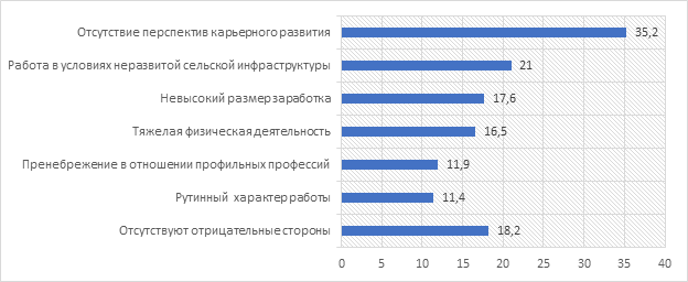 В качестве основных отрицательных сторон работы в агропромышленной индустрии, исходя из результатов исследовательской работы, 35,2% респондентов определили отсутствие перспектив карьерного развития, 21% опрошенных указали работу в условиях неразвитой сельской инфраструктурой, а 17,6% участников опроса обозначили, что отрасли характерен невысокий размер заработка. Лишь 18,2% опрошенных не видят отрицательных сторон трудоустройства в АПК России (рис. 7).