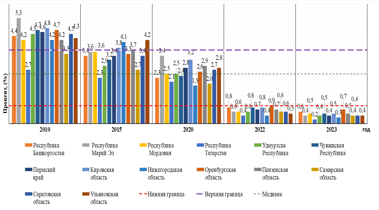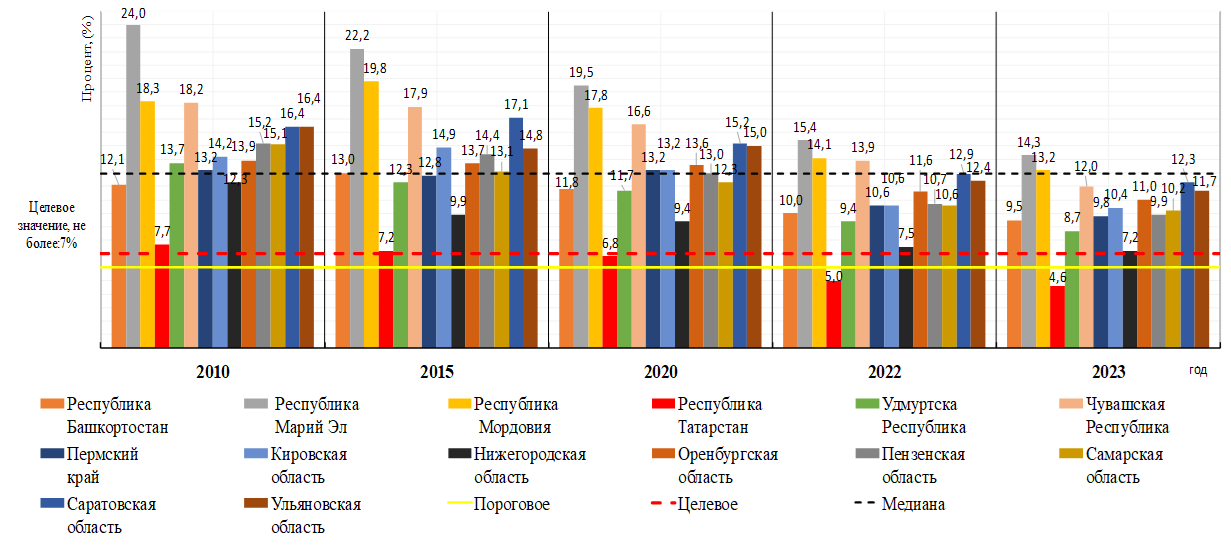 За исследуемый период с 2010 по 2023гг. доля населения с денежными доходами ниже прожиточного минимума (уровень бедности) [6] практически во всех регионах Приволжского федерального округа принимает значения выше целевого «не более 7%» (рис.1). Единственным регионом, в котором фактическое значение показателя «уровень бедности» не превышает целевое значение или примерно равно ему (абсолютное отклонение не превышает 0,7 п.п.), является республика Татарстан: темп снижения уровня бедности составляет 40,2% по отношению к базовому значению за 2010 год. Республика Татарстан является одним из лидеров среди российских регионов по качеству жизни населения, занимая 5 место РИА рейтинга за 2024 год. [8] Анти-лидерами являются Республика Марий Эл (фактическое значение на 2023 год – 14,3%), Республика Мордовия (13,2%), Саратовская область(12,3%). Однако, если рассматривать показатели в динамике, то в целом наблюдается положительный тренд, то есть происходит снижение уровня бедности в регионах Приволжского федерального округа. На уровень бедности и низкие доходы населения влияет тенденция старения населения, а также структура валового регионального продукта (далее – ВРП) регионов и их недостаточная диверсификация. Так, власти Марий Эл отмечают: «Значительная часть трудоспособного населения – около 20% - занята в отраслях социальной сферы, а также у субъектов малого и среднего предпринимательства - свыше 40%, где уровень заработной платы ниже среднего по республике». [1, 13]