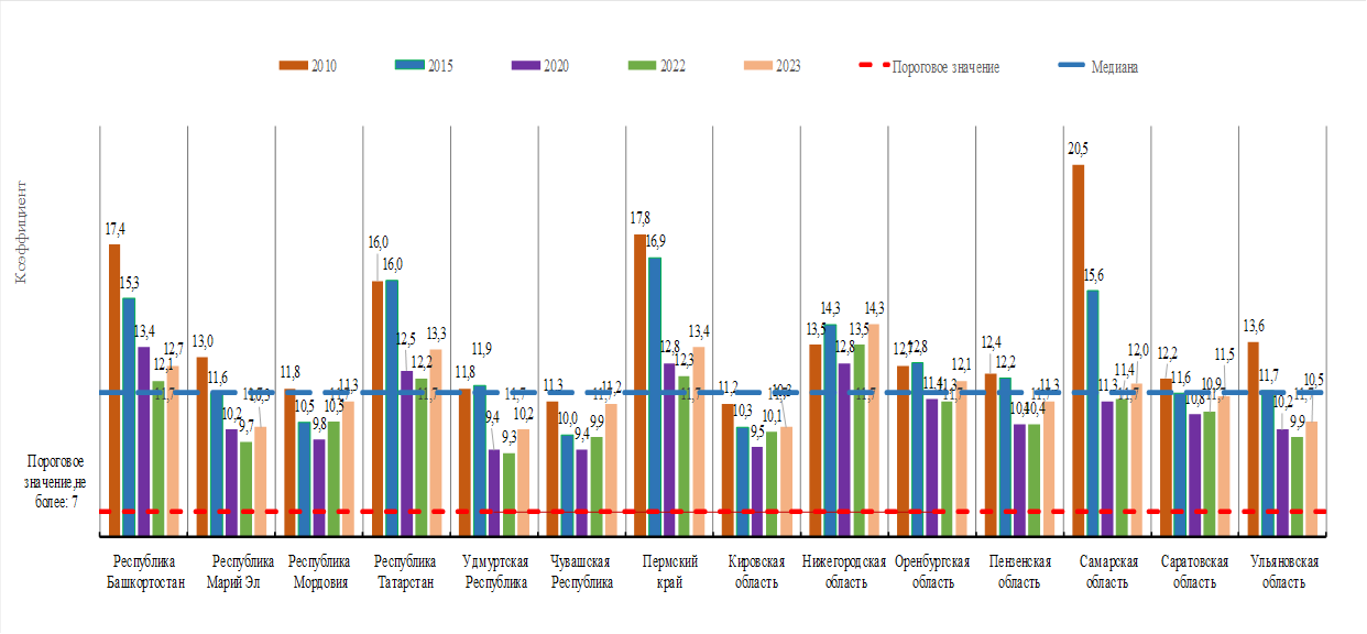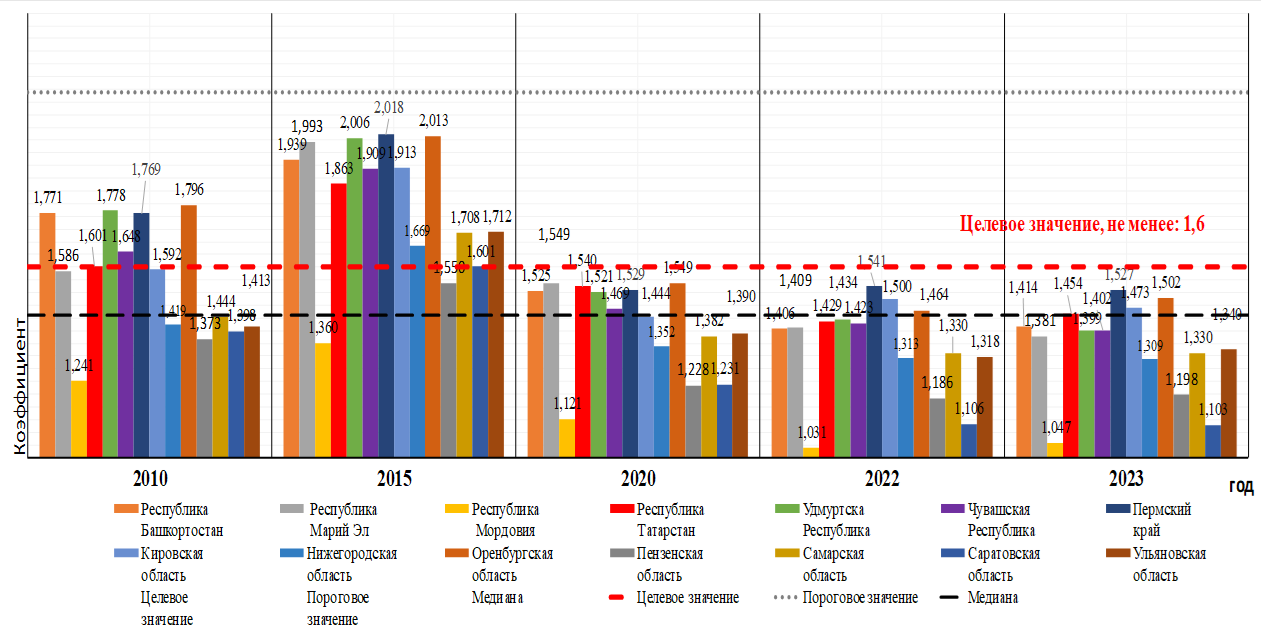 Суммарный коэффициент рождаемости показывает количество детей, которых рожает в среднем одна женщина, находясь в репродуктивном возрасте. Выбор этого индикатора обоснован необходимостью анализа не только общего числа родившихся, но и количества детей, приходящихся на одну женщину. Из рисунка 4 видно, что наиболее благоприятная ситуация, с точки зрения экономической безопасности, была в 2015 году, поскольку только два региона не соответствовали целевому значению «не менее» 1,6, а именно Республика Мордовия на 15% (фактическое 1,36) и Республика Марий Эл почти на 3% (1,55). Примечательно, что Республика Мордовия является анти-лидером на протяжении всех 13 лет и в 2023 году в 1,52 раза отклоняется от цели. Данный показатель напрямую связан с естественной убылью населения, которая в Республике Мордовия составляет -7,3 промилле. Помимо демографических тенденций на суммарный коэффициент рождаемости влияют реальные денежные доходы населения, а также уровень браков и разводов в республике. Уровень бедности в Республике Мордовии превышал целевое практически в 2 раза, т.е. на 6,2 п.п. по состоянию на 2023 год. Среднее значение по округу за 2023 год составляет 1,349, что меньше целевого на 15,6%.