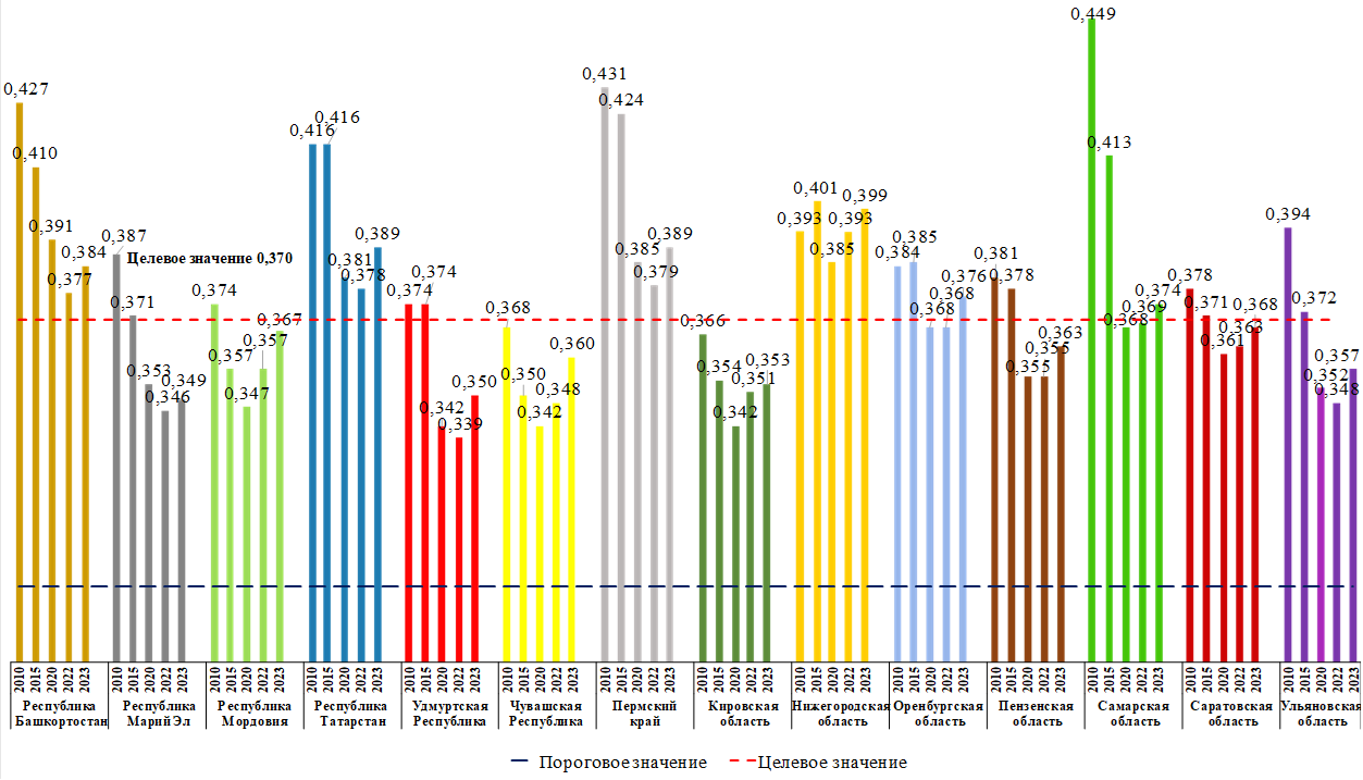 Коэффициент Джини в сравнении с коэффициентом фондов является более универсальным показателем неравенства в доходах, поскольку полностью учитывает разброс значений признака вариационного ряда, в то время как коэффициент фондов учитывает только разрыв, складывающийся между крайними группами. Коэффициент Джини имеет схожую тенденцию: снижение значений показателя за исследуемый период и небольшой рост в 2023 году (рис.3). Превышение целевого значения, взятого с Указа Президента РФ от 07.05.2024 № 309 – «не более 0,37» в 2023 году характерно для Нижегородской области (0,399), Республики Татарстан (0,389) и Пермского края (0,389), Республики Башкортостан (0,384), Оренбургской области (0376). Значительное снижение значения коэффициента произошло в Самарской области – уменьшение на 16,7%, в Пермском крае на 9,4%. В целом тенденция к сокращению неравенства по доходам объясняется ростом социальных выплат, введению прогрессивной шкалы налогообложения по НДФЛ с 2025 года, повышением минимального размера оплаты труда на 16,6% с 16 242 рублей до 22 440 рублей. Тем не менее, важно учитывать выборочность обследования, а также то, что показатель не может учитывать достаточно большой теневой сектор.