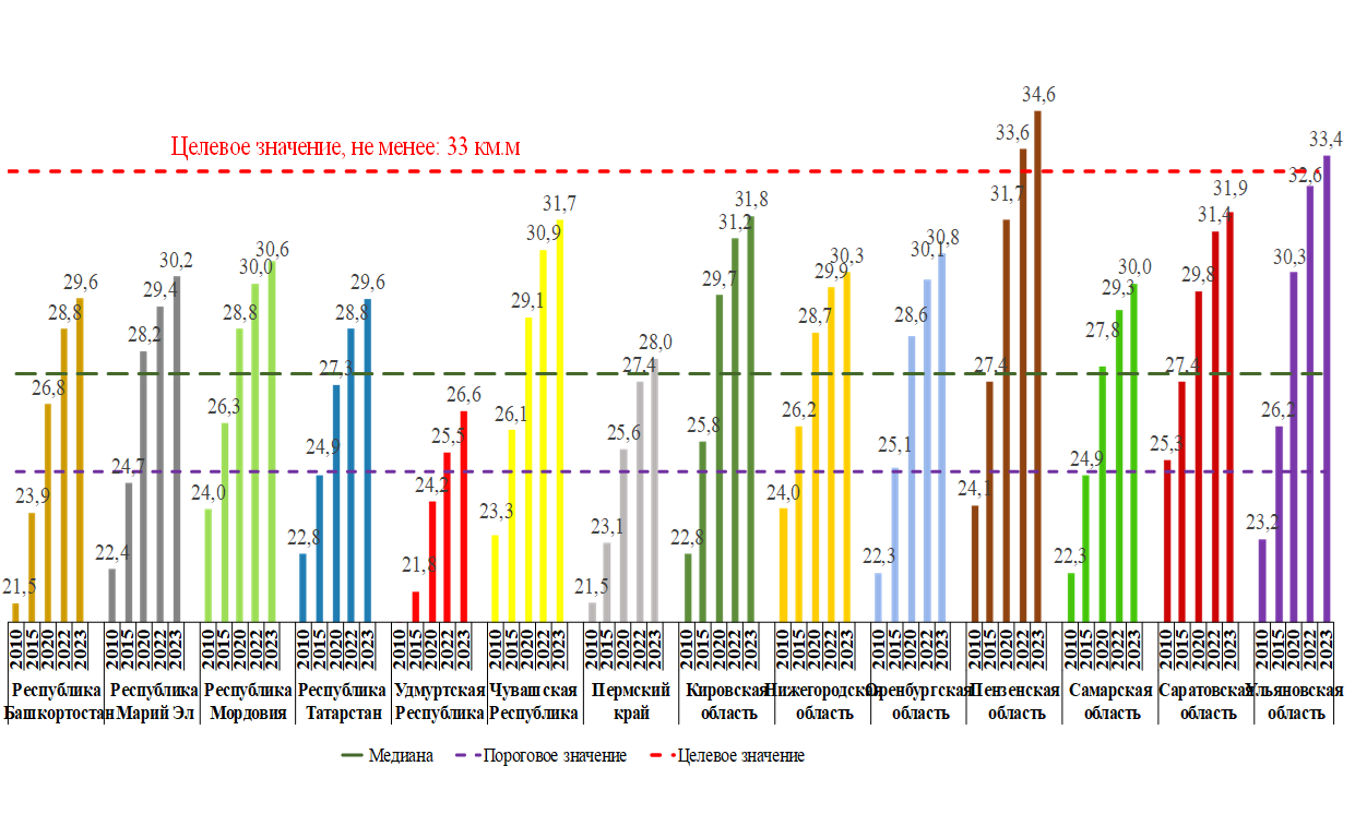 Рисунок 6 иллюстрирует положительный тренд роста общей площади жилых помещений, которая приходится в среднем на одного жителя в регионах Приволжского федерального округа. Тем не менее, за исключением Пензенской области в 2022 и 2023 годах и Ульяновской области в 2023 году все регионы Приволжского федерального округа не достигают целевого значения из Указа Президента № 309 – «не менее 33 кв.м.». Республика Татарстан, являющаяся лидером практически во всех ранее анализируемых показателях, отклоняется от целевого на 3.3 п.п., аналогичное отклонение в Республике Башкортостан. К анти-лидерам относится Удмуртская Республика, в которой отклонение равно 6,4 п.п. в 2023 году, при этом темп прироста относительно 2010 года оставил 33%.