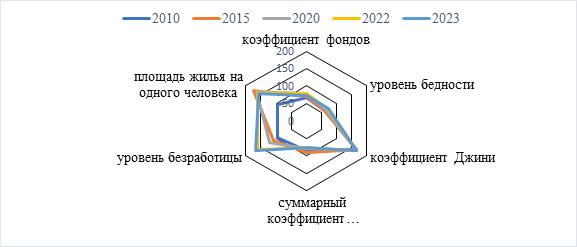 В целом по Приволжского федеральному округу были рассчитаны индексы региональной дифференциации уровня жизни населения, которые для лучшей визуализации представлены в виде лепестковой диаграммы. (рис.7) Исходя из представленной динамики, видно, что показатели, связанные с доходами (коэффициент фондов и уровень бедности), находятся в зоне значительного риска, что свидетельствует об угрозе усиления дифференциации населения по доходам.