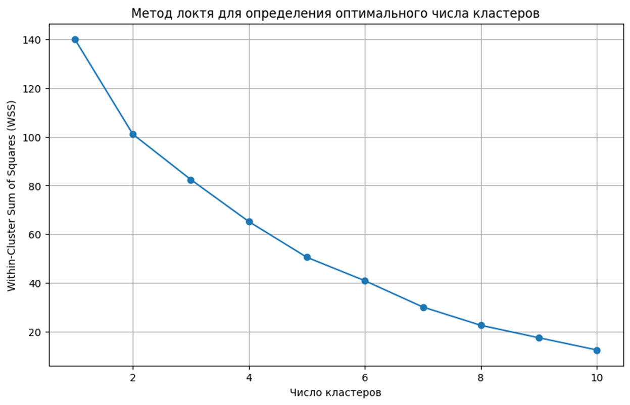 Для определения количества кластеров был выбран метод k-средних. Он применяется в анализе данных благодаря своей способности эффективно группировать объекты по степени схожести их характеристик, что делает его особенно ценным инструментом при исследовании регионов. Алгоритм последовательно минимизирует внутрикластерную дисперсию, стремясь сформировать компактные и однородные группы, в которых регионы оказываются максимально близки друг к другу по совокупности признаков, что позволяет выявлять естественные структурные разделения в данных.