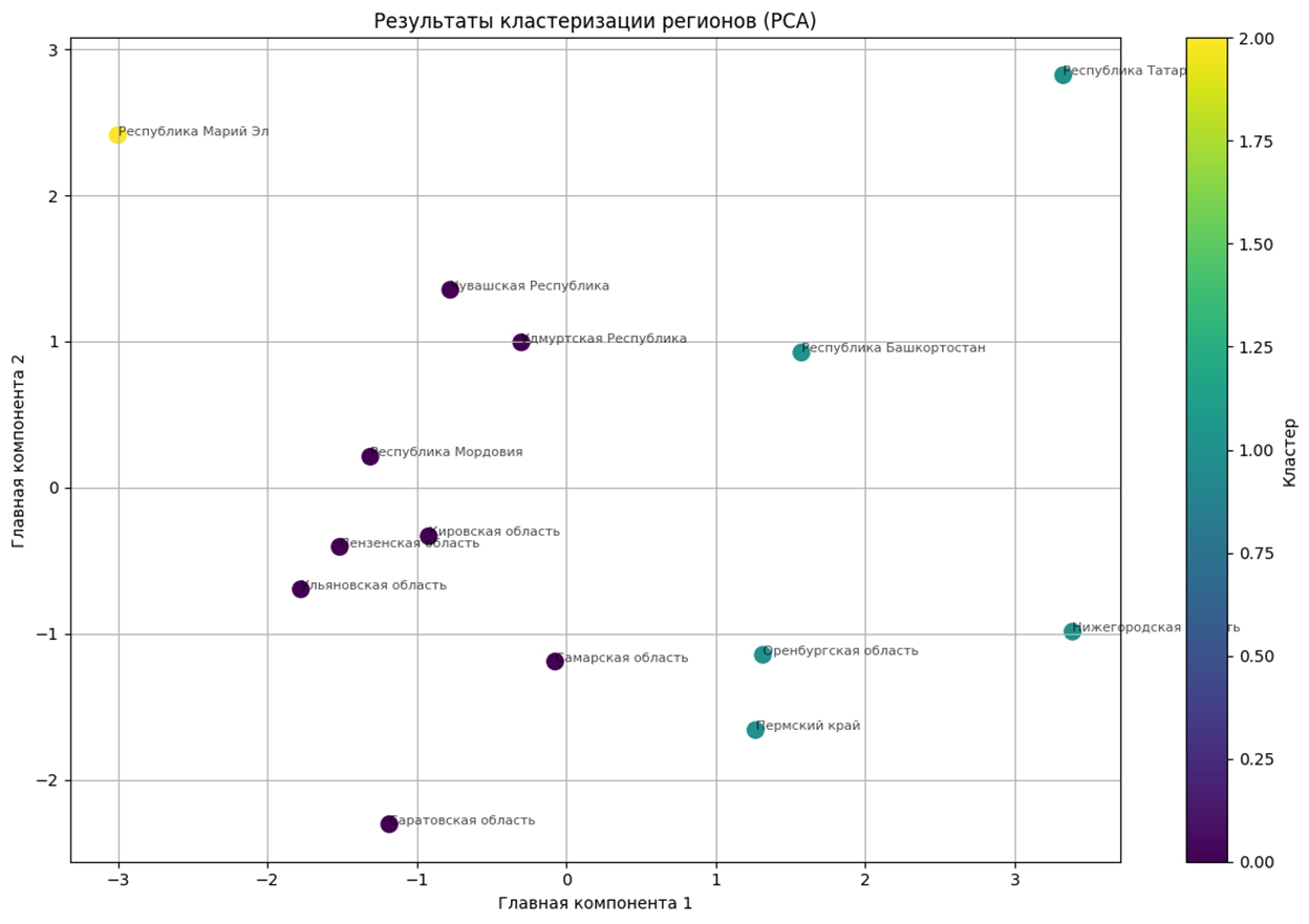 Первый кластер включает регионы-лидеры с высоким уровнем экономического развития. К данной группе относятся Татарстан, Башкортостан, Нижегородская и Самарская области. Для этих субъектов характерны высокие значения по первой главной компоненте, интенсивная экономическая активность, низкий уровень безработицы и относительно благополучная демографическая ситуация.