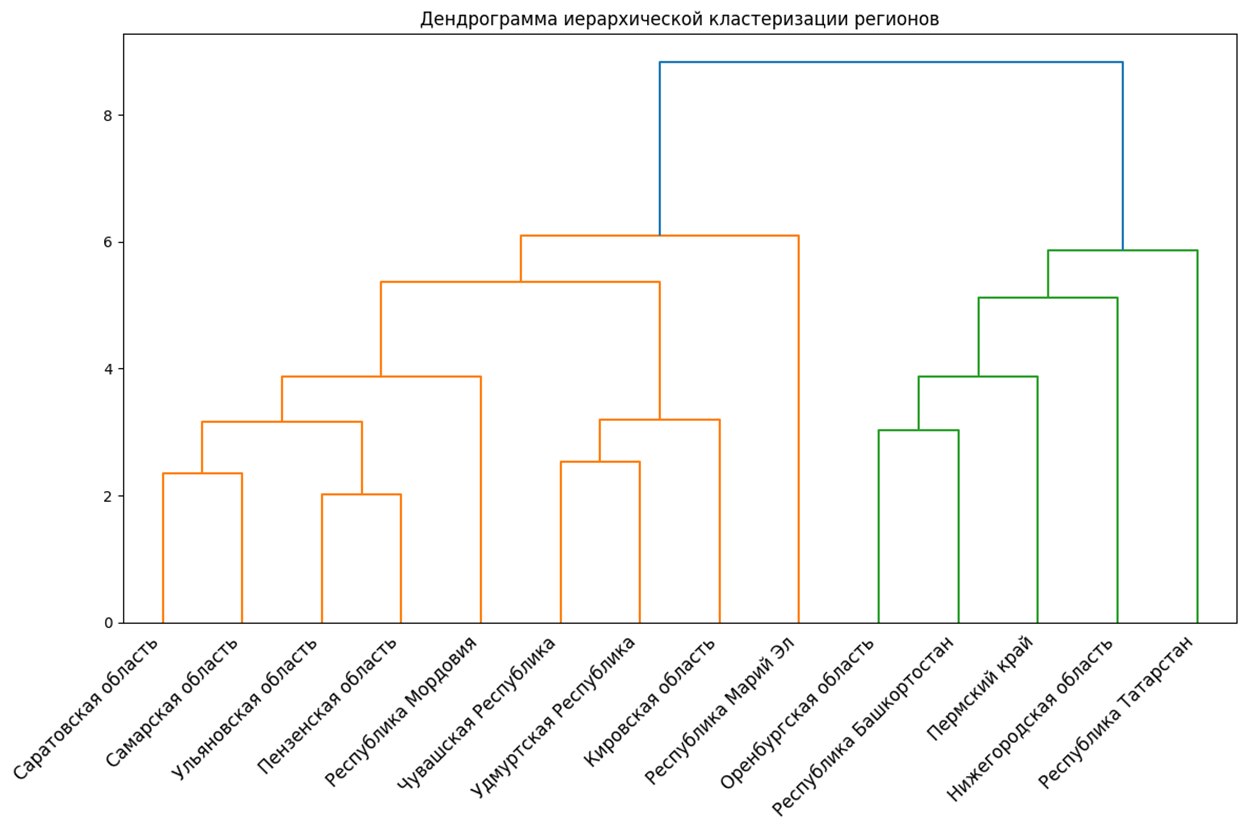 Анализ дендрограммы выявил три основных кластера с различной степенью внутренней гомогенности (рис. 11). В левой части дендрограммы локализована группа регионов с наиболее высокими показателями развития. Ядро данного кластера формируют Республика Татарстан и Республика Башкортостан, демонстрирующие минимальное расстояние слияния (3–4 единицы), что свидетельствует об их высокой схожести по анализируемым параметрам. К данной группе последовательно присоединяются Нижегородская и Самарская области. Центральный кластер объединяет регионы со средним уровнем развития. Наиболее тесные связи наблюдаются между Удмуртской Республикой и Чувашской Республикой, при этом последующее присоединение Пермского края, Кировской и Оренбургской областей происходит при дистанциях слияния 5–6 единиц, что указывает на умеренную степень сходства.