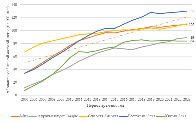По данным статистики Всемирного Банка (World Bank) количество абонентов мобильной сотовой связи в странах Африки к югу от Сахары в течение последних двадцати лет возросло более чем в шесть раз, темп роста за последние пять лет достиг двадцати процентов, что выше, чем в любом другом регионе мира (рисунок 1). Лидерами на континенте являются Ботсвана, Маврикий и Кения, количество абонентов в этих странах значительно превышает среднемировое значение.
