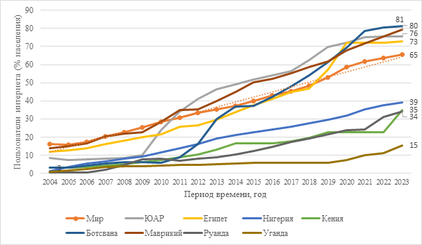 Одновременно, почти половина населения континента, в основном жители сельских районов, не имеет доступа к электроэнергии [27] и интернету [42]. В отдельных странах, таких как ЮАР, Ботсвана, Маврикий и Египет, наблюдается стремительный рост пользователей интернета, при этом для Нигерии и Кении, ключевых акторов цифровизации континента [10], значение показателя остается все еще на низком уровне (рисунок 2). С увеличением доступности электроэнергии, мобильной связи и интернета рынок цифровых услуг в Африке продолжит расти [7].
