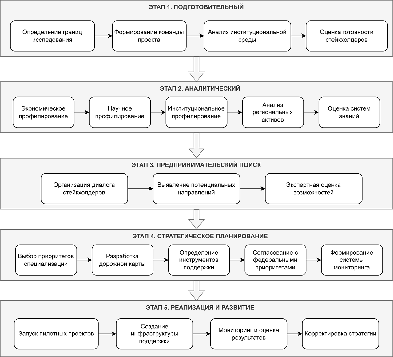 Ключевым этапом выступает предпринимательский поиск, в рамках которого осуществляется структурированный диалог между представителями власти, бизнеса, науки и гражданского общества. Стоит подчеркнуть, что без развитого взаимодействия стейкхолдеров у региона нет перспектив формирования устойчивых конкурентных преимуществ. Этап стратегического планирования решает задачи трансформации результатов диалога в приоритеты специализации и механизмы поддержки, при этом обеспечивается согласование с федеральными стратегическими документами, что ведет к повышению эффективности использования бюджетных ресурсов. Финальный этап заключается в практическом воплощении разработанной стратегии посредством запуска пилотных проектов и создания инфраструктуры поддержки.