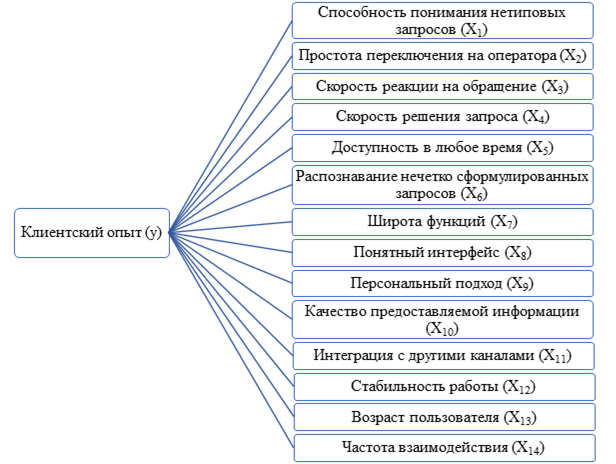 Для оценки значимости выделенных на предыдущем этапе исследования факторов клиентского опыта при взаимодействии с чат-ботами использован метод корреляционно-регрессионного анализа. Цель его проведения – определить, какие из рассматриваемых составляющих оказывают наиболее сильное влияние на опыт клиентов при контакте с технологией.