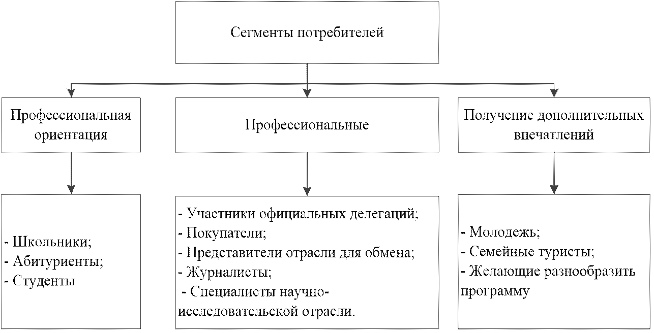 Выделяя основные группы потребителей промышленного туризма, следует отметить, что каждый сегмент требует разработки индивидуального подхода к проведению тура или экскурсии с учетом не только интересов, но и построения процессов показа и рассказа, вовлеченности в определенную деятельность, а также выбора тем.