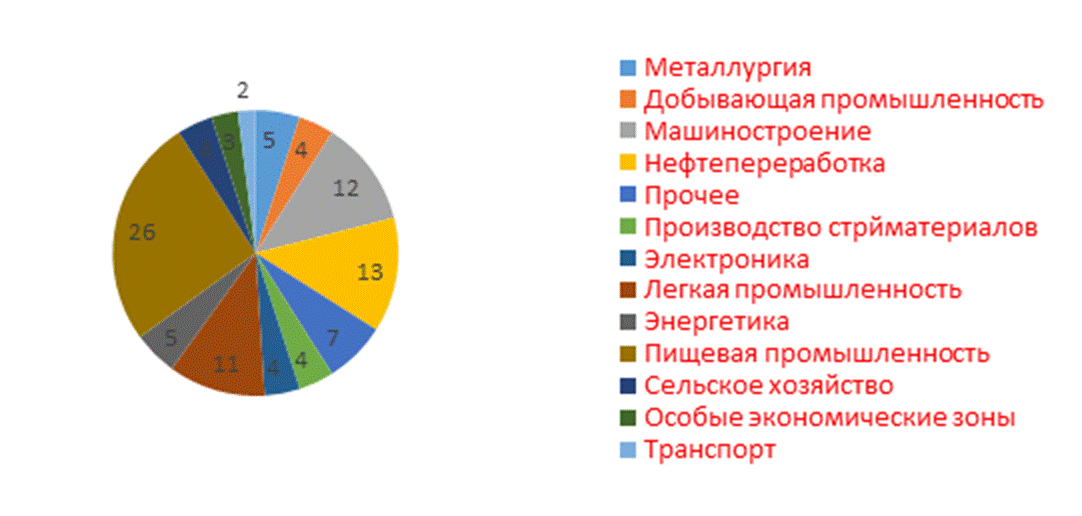 Среди отраслей выделяются пищевая промышленность машиностроение, сельское хозяйство, металлургия, нефтегазовая и химическая промышленность.