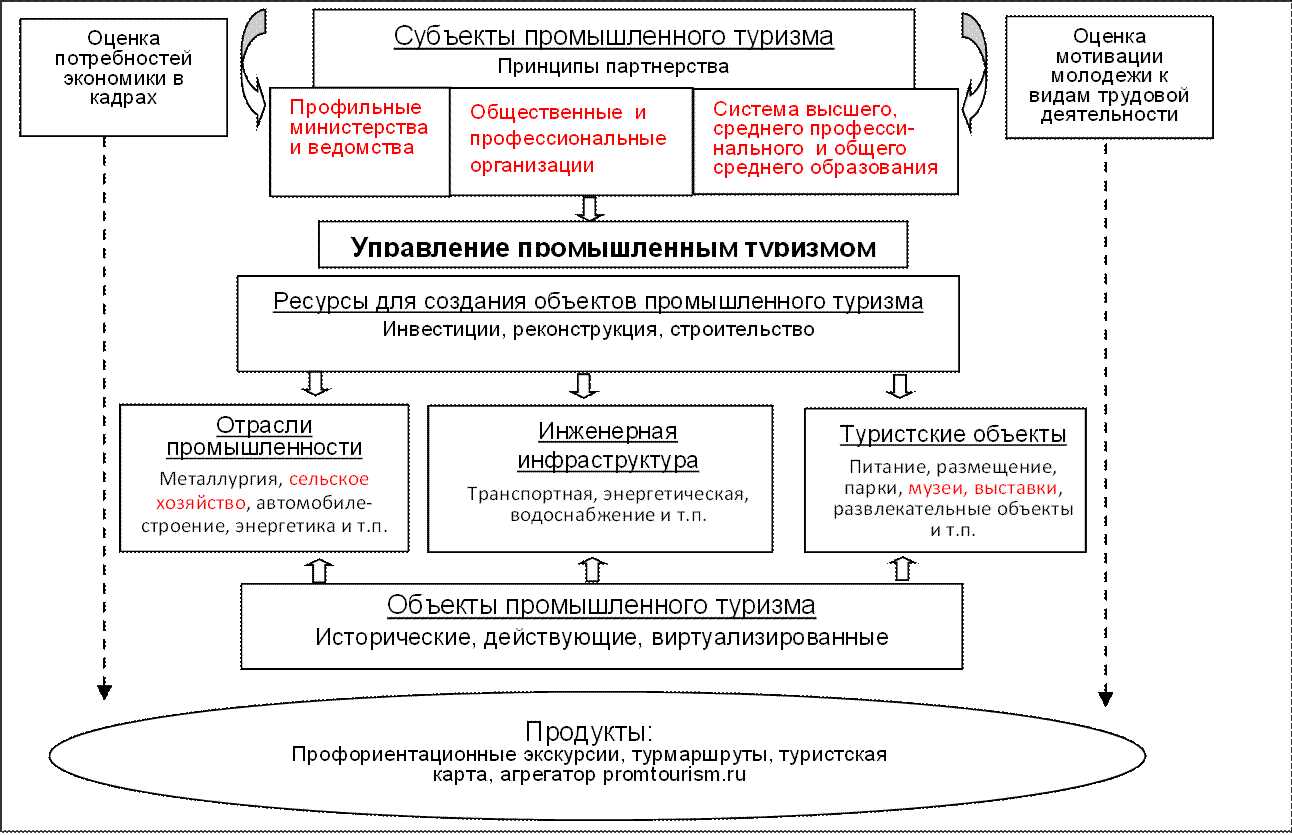 Промышленный туризм как инструмент продвижения производственных предприятий с точки зрения их позиционирования на региональном рынке, привлечения внимания к производству, стратегического кадрового управления. Возможности организации промышленного туризма Определяются взаимодействием государства, общественных институтов, непосредственно самих индустриальных субьектов и системы образования, которая в большей степени является поставщиков экскурсантов.