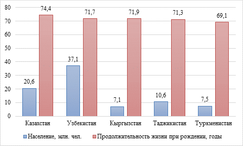 Анализ демографических показателей стран Центральноазиатского региона (рис. 1) свидетельствует о сходстве в показателях средней продолжительности жизни. Более высокая численность населения в отдельных странах оказывает значительное влияние на формирование социально-экономической политики, требует увеличения объёмов инвестиций в здравоохранение, образование и занятость. При этом уровень продолжительности жизни остаётся относительно стабильным в большинстве стран, что свидетельствует о схожих проблемах и успехах в области общественного здравоохранения и качества жизни. Наименее благоприятные значения в Таджикистане и Туркменистане указывают на наличие структурных вызовов, связанных с уровнем медицинского обслуживания, условиями труда, экологической ситуацией и социальными гарантиями.