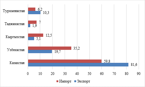 Данные рисунка 3 позволяют провести анализ внешнеторговой активности стран Центральной Азии, включая соотношение объемов экспорта и импорта товаров в пяти государствах региона. Следует отметить наличие значительных различий в торговых стратегиях и структуре внешнеэкономических связей между странами региона: