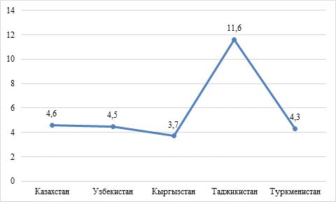 На фоне относительной стабильности показателей в Казахстане, Узбекистане, Туркменистане и Кыргызстане, где уровень безработицы варьируется в пределах от 3,7% до 4,6%, особенно выделяется Таджикистан (рис. 4). Его уровень безработицы (11,6%) значительно превышает средние показатели региона, что свидетельствует о наличии серьёзных структурных проблем на рынке труда. Такая ситуация обусловлена ограниченным доступом к формальной занятости, высокой долей трудовой миграции, а также недостаточной развитостью частного сектора и низкой инвестиционной активностью.