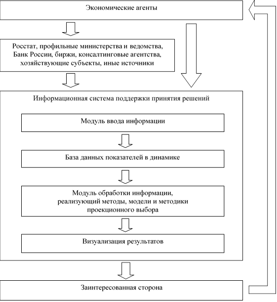 В статье предлагается следующая концептуальная модель системы поддержки проекционного выбора, способствующая принятию научно обоснованных решений различными стейкхолдерами (рисунок 1). Ключевым звеном модели выступает информационная система. Система поддержки принятия решения объединяет модули ввода и вывода информации, базу данных основных показателей исследуемых экономических систем в динамике, а также блок обработки информации, реализующий методы, модели и методики проекционного выбора. Исходными для модели служат как открытые данные, публикуемые на информационных ресурсах Росстата, профильных министерств и ведомств, Банка России, бирж, консалтинговых агентств, хозяйствующих субъектов и пр., так и внутренняя информация экономических агентов, которая может быть недоступной для внешних пользователей. На каждом иерархическом уровне используется свой специфичный набор показателей и проекций.
