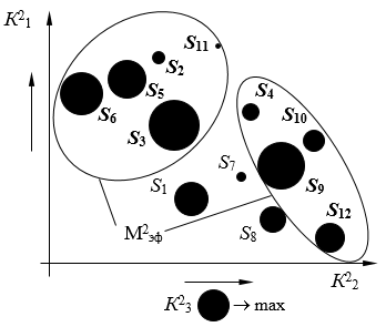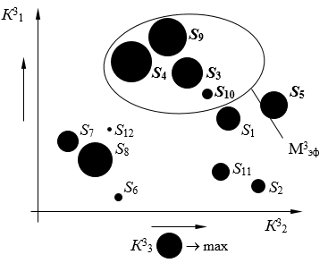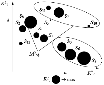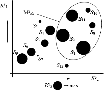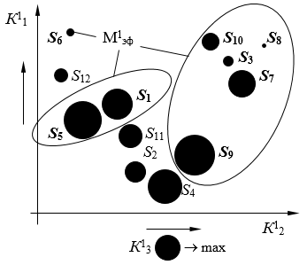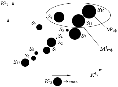 Паретовское множество во второй проекции примет вид М2эф = {S2, S3, S4, S5, S6, S9, S10, S11, S12}.