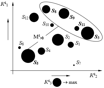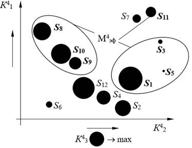 Паретовское множество в четвертой проекции примет вид М4эф = {S1, S3, S5, S8, S9, S10, S11}.