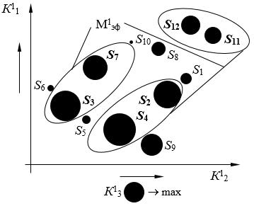 Паретовское множество в первой проекции примет вид М1эф = {S2, S3, S4, S7, S11, S12}.