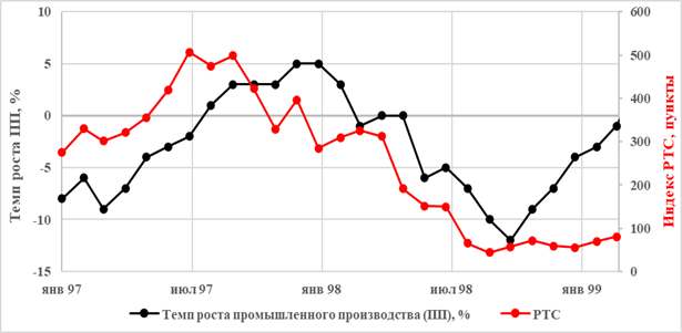 Рисунок 1 – Сравнение динамики индекса РТС и темпа прироста промышленного производства для кризиса 1998 года