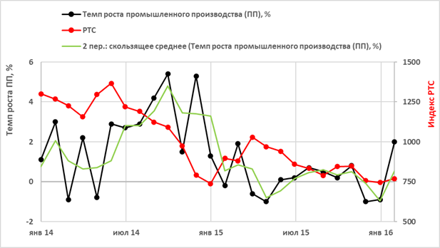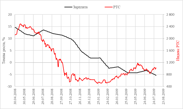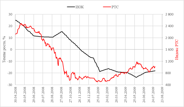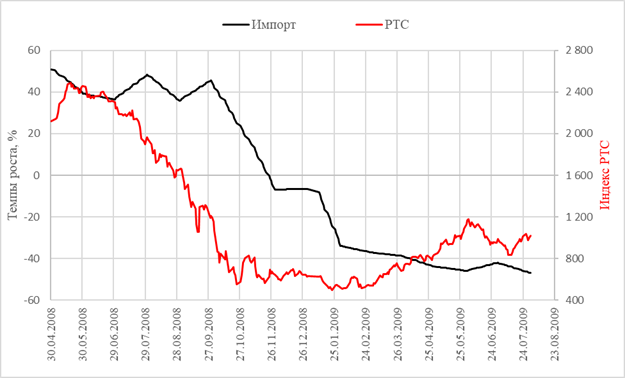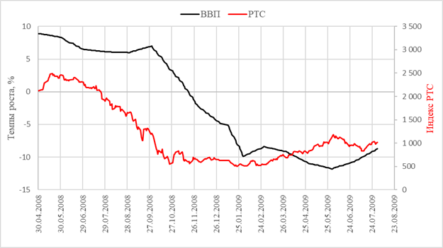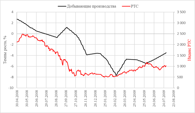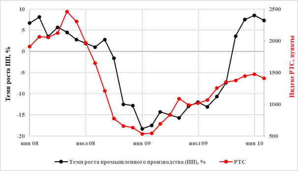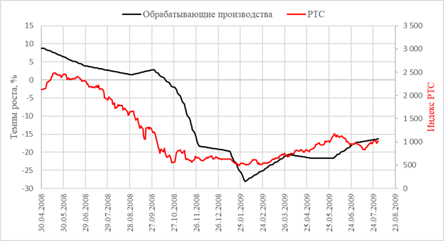 Рисунок 3 – Сравнение динамики индекса РТС и темпа прироста промышленного производства для кризиса 2008 года