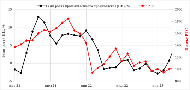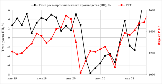 Рисунок 5 – Сравнение динамики индекса РТС и темпа прироста промышленного производства для кризиса 2022 года