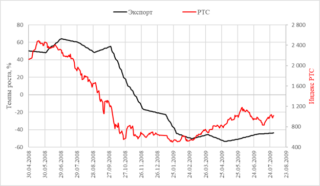 Рисунок 10 – Динамика индекса РТС и темпа прироста физического объема экспорта