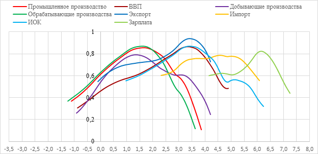 Анализ рисунка 14 позволил определить времена опережения индекса РТС по отношению к снижению темпов прироста различных экономических показателей в результате развития кризиса. На рисунке функции кросс-корреляции имеют разную ширину. Чем шире функция кросс-корреляции, тем слабее связь между двумя временными рядами или сигналами, или тем больше временной лаг между ними. В широкой функции кросс-корреляции максимум является менее выраженным и распределен на большем интервале времени. Это означает, что связь между рядами не является сильной и устойчивой, а точность нахождения периода опережения падает.