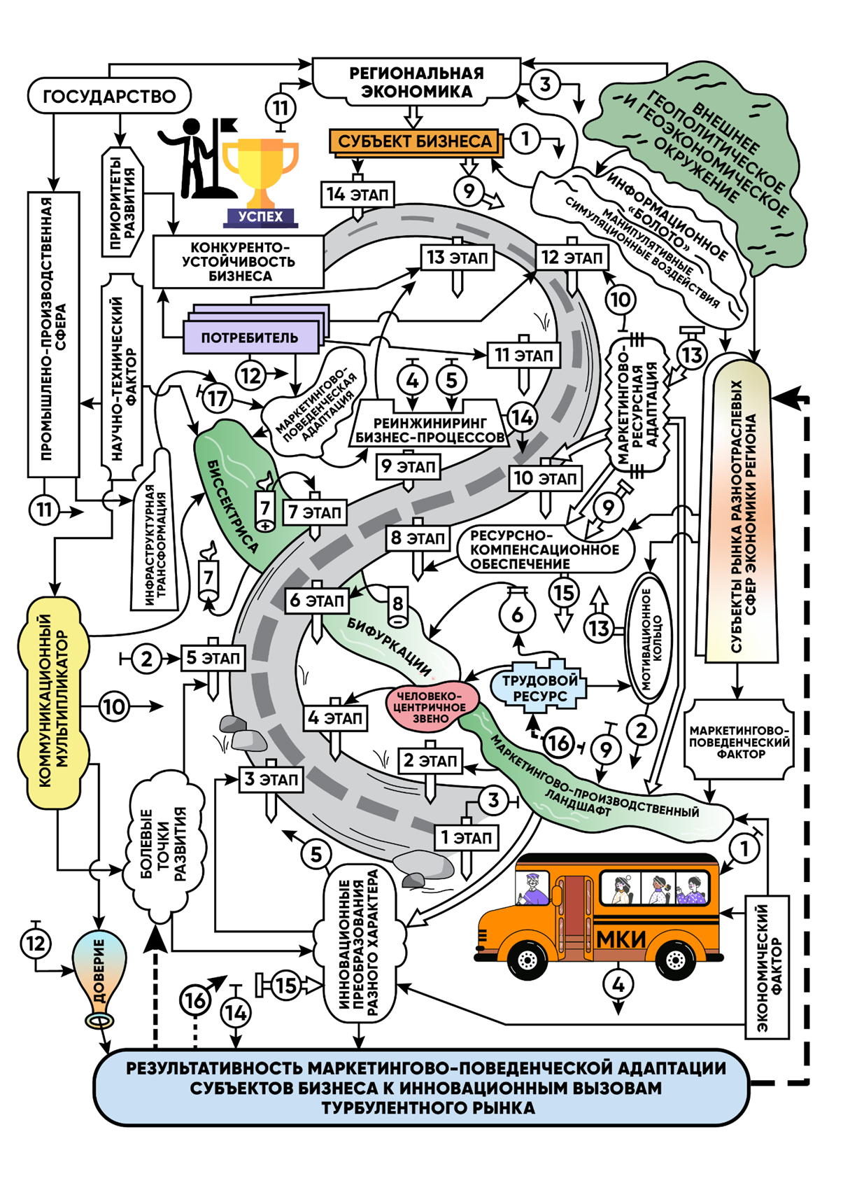 Обозначения: 1 – управляющие сигналы, формируемые субъектом бизнеса, на укрепление им мотивационно-коммуникационного иммунитета в интересах эффективной адаптации к вызовам разного происхождения; 2 – интегративные сигналы, исходящие от субъектов рынка разноотраслевых сфер экономики региона, мотивированных на реализацию рациональной маркетингово-ресурсной трансформации к вызовам из разных источников их возникновения; 3 – управляющие сигналы, формируемые в региональной экономике на выбор стратегий развития бизнеса субъектами разных отраслей и сфер деятельности в маркетингово-коммуникационном формате; 4 – включение мотивационно-коммуникационного иммунитета субъекта в процесс масштабирования бизнеса и выбора им направленности и форм реинжиниринга бизнес-процессов; 5 – воздействие инновационных преобразований разного характера на содержание реинжиниринга бизнес-процессов; 6 – субъективизация процессов маркетингово-поведенческой адаптации трудовым ресурсом и ее влияние на выбор решений по ослаблению (демпфированию) нежелательных поведенческих реакций бизнеса и его персонала на вызовы разного происхождения или же по уничтожению (ликвидации) звеньев (поведенческих деструкторов), порождающих их происхождение; 7 – поведенческий демпфер; 8 – поведенческий деструктор; 9 – управляющие сигналы, исходящие от субъекта бизнеса, направленные на формирование благоприятного маркетингово-поведенческого ландшафта; 10 – воздействие коммуникационного мультипликатора на выбор субъектом модели управления им его конкурентоустойчивостью в векторе инновационных изменений; 11 – воздействие промышленно-производственной сферы на состояние региональной экономики; 12 – сигналы, исходящие от потребителей товаров и услуг, влияющие на объем, характер и содержание задач, формируемых внутри бизнеса в рамках выстраиваемых субъектами процессов маркетингово-поведенческой адаптации и выбора ими рационального инструментария по управлению изменениями; 13 – влияние интегративного мотивационного фактора на характер, масштаб и воплощение маркетингово-ресурсной адаптации субъектов бизнеса в условиях нарастания инновационных вызовов изменяющегося рынка; 14 – воздействие реинжиниринга бизнес-процессов на результативность маркетингово-поведенческой адаптации субъектов бизнеса в интересах реализации инновационных изменений; 15 – ресурсно-компенсационное регулирование при построении субъектами инновационных преобразований разного характера; 16 – сигналы обратной связи, формируемые субъектами бизнеса по корректировке их ресурсного потенциала; 17 – влияние инфраструктурных трансформаций на масштабы и характер маркетингово-поведенческой адаптации бизнеса; МКИ – мотивационно-коммуникационный иммунитет субъекта.